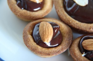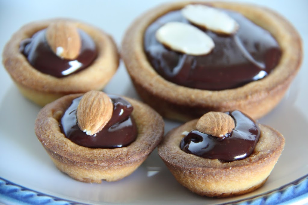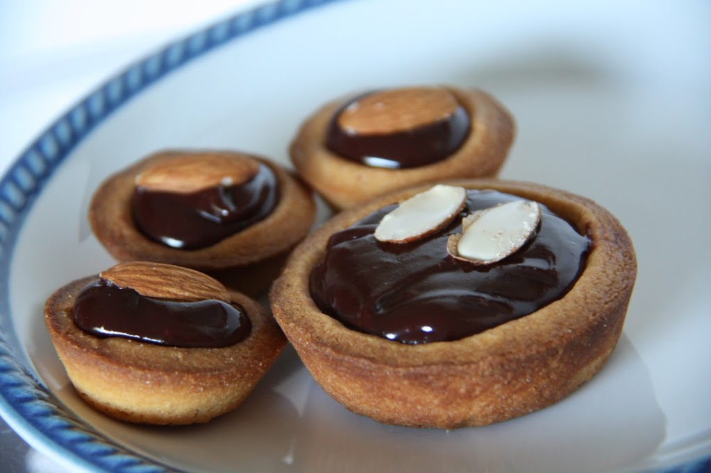 Queste sono tartellette al cioccolato, fatte col mio cavallo di battaglia, la pasta frolla, e una specie di ganache (ma più soda) improvvisata sul momento. Questi piccoli dolcetti sono ottimi per un tè insieme alle amiche o una colazione sfiziosa. La bontà della pasta frolla sta nella semplicità e genuinità degli ingredienti, naturali e freschi. Il gusto della ganache è bilanciato tra la dolcezza della pasta di mandorle e l’acidità del cioccolato fondente.
