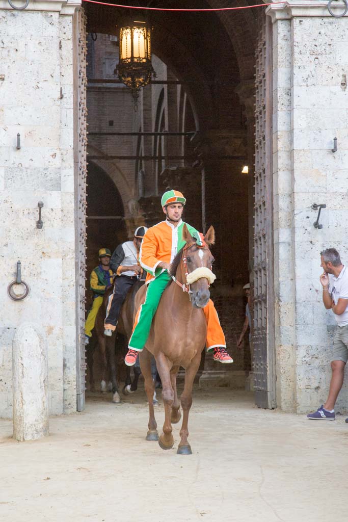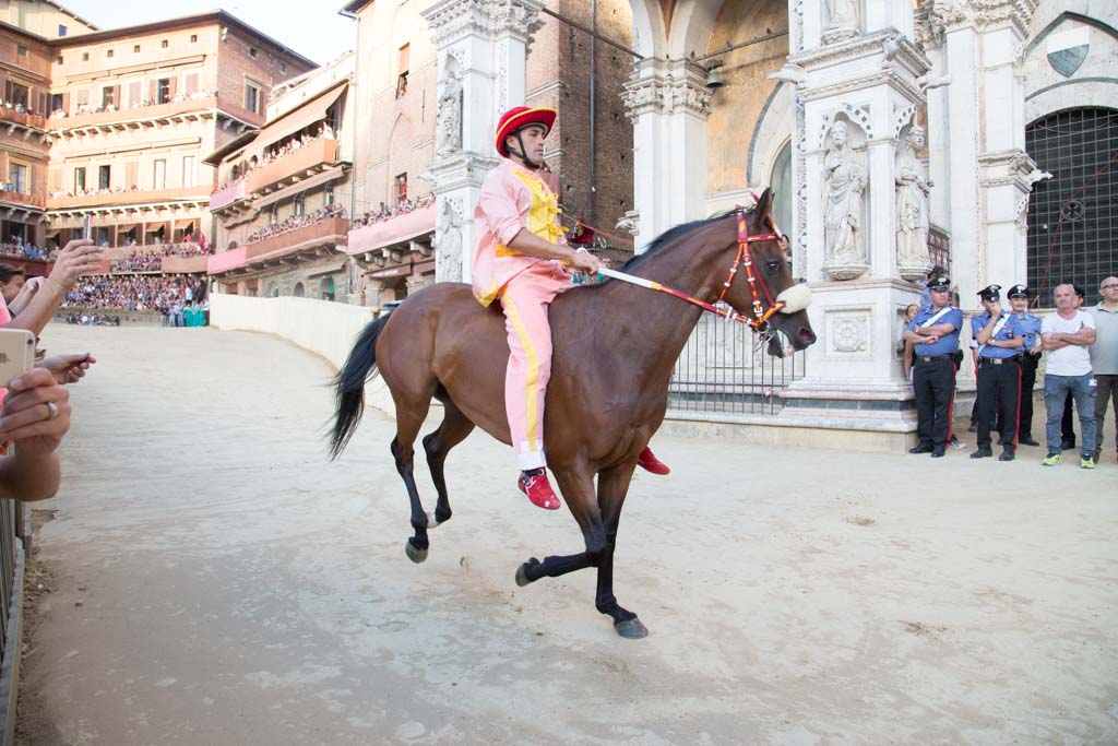 Dalle 14.30 in poi è un’attesa infinita. In ogni Contrada la tensione è tangibile e l’aria è così pensante che o passeggi per la città o ti rinchiudi in casa, un po’ perchè fa troppo caldo, un po’ per cabala. Noi, tra una granita, un ciaccino e un tentativo di visita a un giardino (fallito, purtroppo) siamo arrivati alle 17 come se nulla fosse e abbiamo sentito i rintocchi di Sunto, la campana nella Torre del Mangia che chiama i Contradaioli. Dopo i controlli, siamo entrati in Piazza del Campo senza problemi per assistere al Palio, che sarebbe iniziato per le 19. Vuoi sapere cosa mi ha stupito di più in Piazza del Campo? Il silenzio di tutti quanti gli spettatori e i Contradaioli durante il sorteggio alla Mossa, quando cioè viene stabilita la posizione dei cavalli nella partenza del Palio di Siena. La tensione permeava l’aria, la sofferenza e la preoccupazione per la propria Contrada potevi sentirle in maniera tangibile. É stata un’emozione schiacciante, tant’è che ancora adesso che la ricordo un brivido mi corre lungo la schiena.Il Palio? In sè per sè la corsa dura qualche minuto, ma il Palio abbraccia Siena 365 giorni l’anno