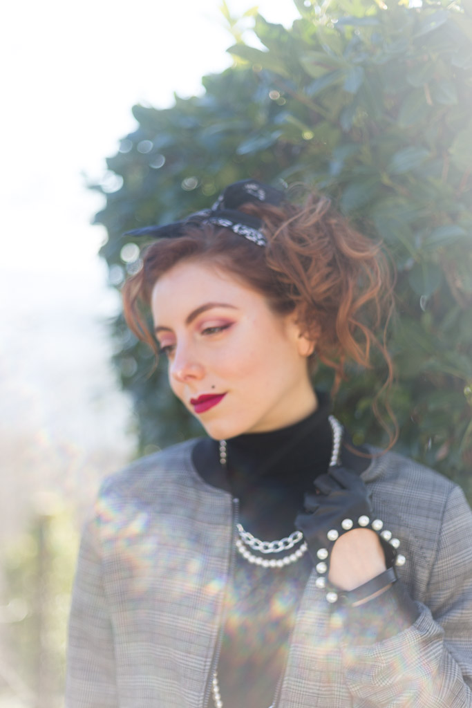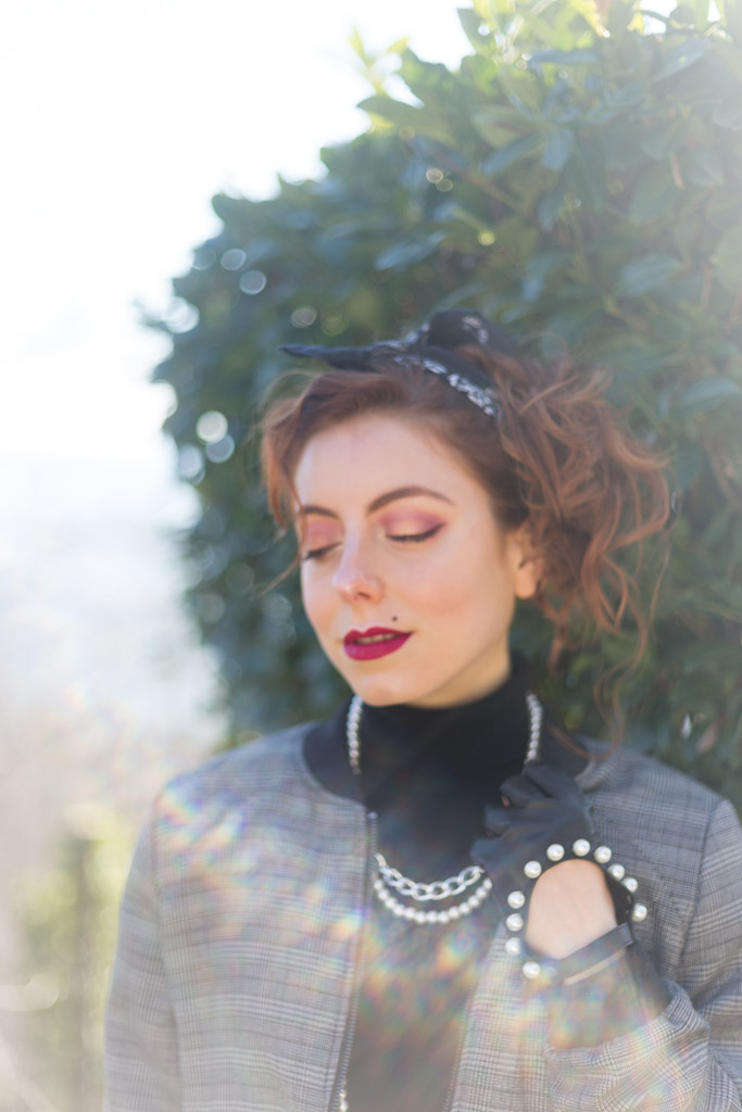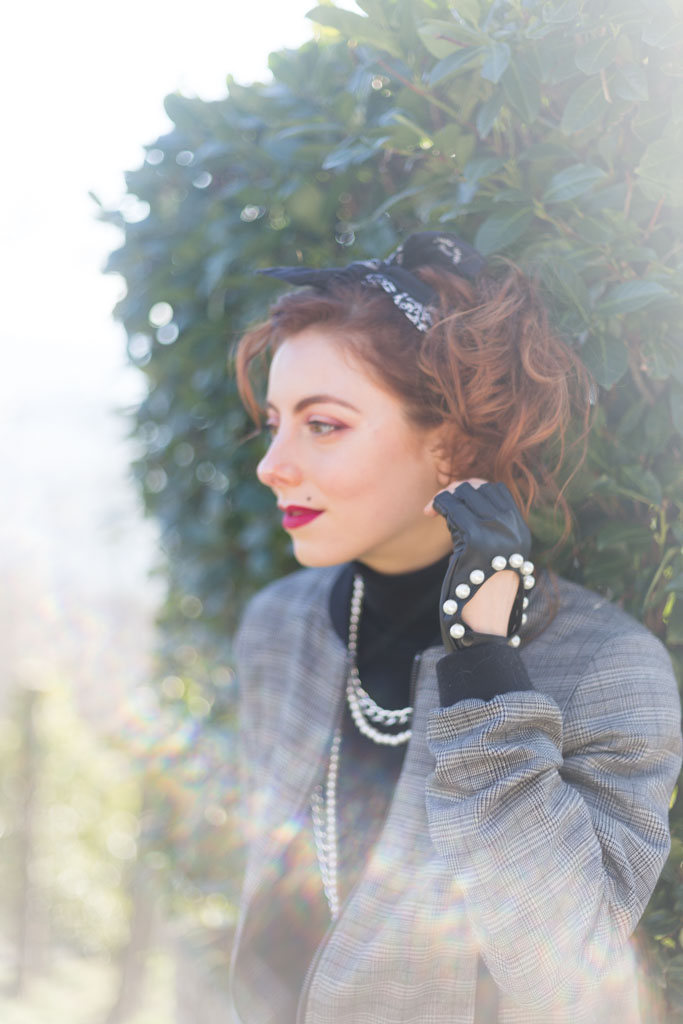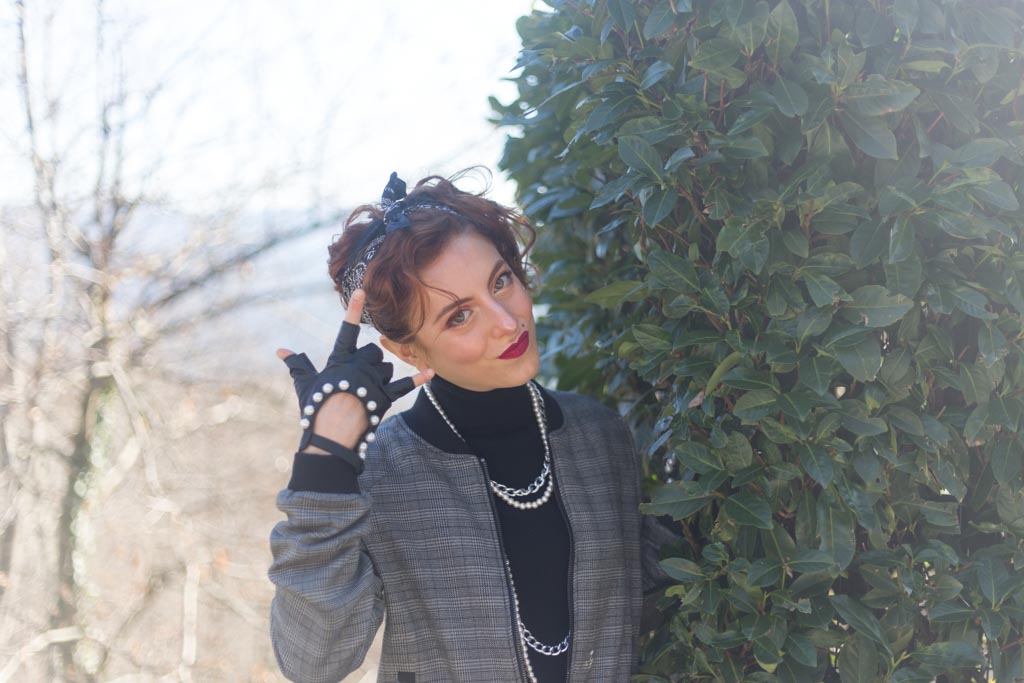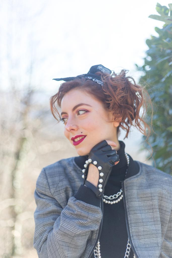 Sfida accettata! Cosa ci occorre? Innanzitutto spalline per dare più struttura alla figura. Soprattutto se la giacca o il bomber con cui le indossi è leggermente over. Il risultato? Una figura più strutturata, appunto e più autoritaria, ma con stile. Tip di stile: che sia una giacca o un bomber gioca coi colori e con le fantasie. Il secondo ingrediente sono i gioielli, meglio se di bigiotteria. Tip di stile: senza paura, mischia diversi tipi di metallo e abbina le perle con tutto quello che ti viene in mente. Sì all’abbondanza di bracciali e collane. Guanti senza dita? Sì, soprattutto se sono in pelle e hanno delle applicazioni sopra. Punta tanto anche sull’acconciatura da indossare. Puoi appuntare i capelli e indossare una bandana come ho fatto io o lasciarli sciolti: l’importante è che siano messy, ma non troppo.Cosa sto indossando in queste foto:
