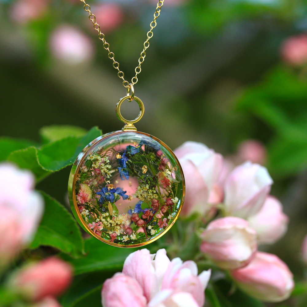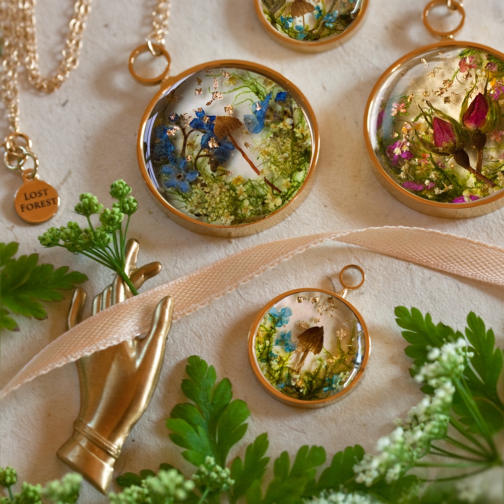 Sono rimasta profondamente colpita dalla meticolosità del tuo lavoro. Puoi spiegarci come nasce un gioiello Lost Forest? Grazie! Si tratta in effetti di un processo molto complesso per la realizzazione di ciascun Looking Glass; una mano ferma e molta pazienza è estremamente necessaria! Io coltivo i fiori nel mio giardino o li raccolgo dalla nostra fattoria e dai campi. Porto nel mio laboratorio il tutto e conservo sapientemente ogni oggetto per diverse settimane. Dopo che sono completamente essiccati, inizio a sistemarli, realizzando un disegno all’interno di cornici d’oro fatte a mano. La disposizione della piccola scena è molto organica. Amo la spontaneità e mi basta vedere semplicemente quali fiori sono davanti a me per costruirci un mondo in miniatura. La scena è poi sigillata in una bella resina di pino naturale trasparente, lavorata a strati sottili. L’intero processo richiede fino a due settimane solo per un pezzo. Mi piace lavorare su piccola scala e in piccoli lotti, perché rende il lavoro più speciale per me, e un vero e proprio lavoro d’amore.Un vero e proprio lavoro d’amore: i gioielli botanici irlandesi