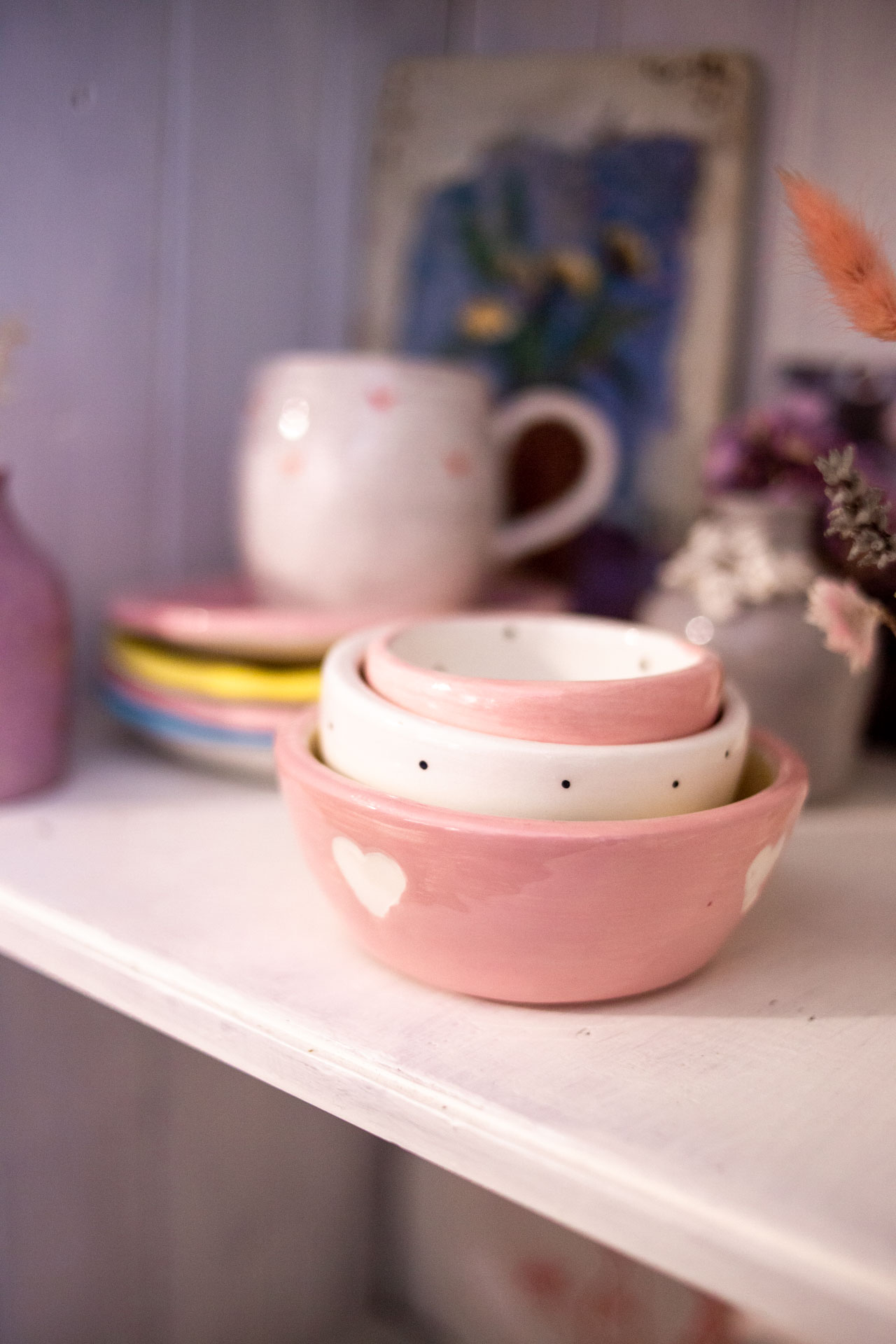 Maria Chiara, quando hai cominciato a realizzare i primi oggetti in argilla e da chi hai imparato? Il paese di Bacchereto ha una lunga tradizione di ceramisti, risalente addirittura al ‘300. Qui infatti si producevano anticamente un gran numero di maioliche, anche aiutati dalla natura argillosa del terreno. Nella mia famiglia c’era uno zio, appassionatissimo di ceramica e in grado di realizzare cose incredibili. Da parte mia, questo mondo è sempre stato mio e ho avuto la fortuna di lavorare accanto a un maestro che faceva questo mestiere da più di 40 anni che mi ha insegnato tanto. Il tornio è come uno strumento musicale, più si suona più si impara a conoscere e si fa pratica. Così per le ceramiche. Più creo e più imparo dal materiale stesso che ho tra le mani. Quali sono le tue maggiori fonti di ispirazione quando crei? Tutto quello che mi ispira è accanto a me! La natura stessa ha tantissimo da raccontare e amo riportare alcuni dei suoi particolari nelle mie creazioni. Un bocciolo dentro a una tazza da tè, una simpatica coccinella su un cucchiaino o una gemma pronta a sbocciare su un piattino da colazione. Questi sono tutti particolari che colgo nella mia vita di tutti i giorni, tra fiori, vigneti e uccellini che cantano. La cura del dettaglio inoltre viene direttamente da una scuola di estetica che ho frequentato e le cui nozioni applico oggigiorno nella produzione delle mie ceramiche (chi non si è incantato di fronte ai cuoricini delle tazze di Maria Chiara? ndF)Set giocosi e ceramiche con particolari in oro